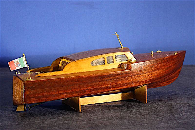 Motoscafo di rappresentanza in servizio negli anni ’50. Il modello, in scala 1:20, è costruito in legno con la tecnica delle ordinate e del fasciame. Lo scafo è trattato con vernice trasparente per lasciare in evidenza la venatura del legno. |