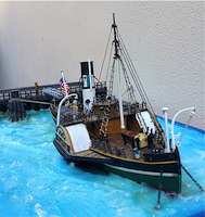 ruota a pale. Il rimorchiatore fu ricostruito a Bill Quay, Sunderland, nel corso del 1969, e fu modificato per attraversare l'Oceano Atlantico con i propri mezzi. Furono installati strumenti di navigazione moderni, radio, timoneria chiusa e fu convertito dal carbone al gasolio. Fu anche attrezzato con vele che dovevano assistere la navigazione in presenza di vento e furono installate cabine per l'aquipaggio. Così l'Eppleton Hall divenne parte della collezione privata di Kortum e fu, come tale, registrato. Il 18 settembre 1969 si diresse verso San Francisco, attraversò il canale di Panama, transitò sotto il Golden Gate Bridge e, a fine marzo 1970, attraccò dopo sei mesi e nove giorni e una percorrenza di 11.000 miglia. La durata del viaggio fu determinata dalla scarsità di combustibile imbarcabile e dalla limitata potenza complessiva. Kortum donò poi, nel 1979, il rimorchiatore al National Park Service. Ora la nave è attraccata al Hyde Street Pier, San Francisco. Così restaurato somiglia alla sua condizione nel 1946. |