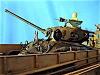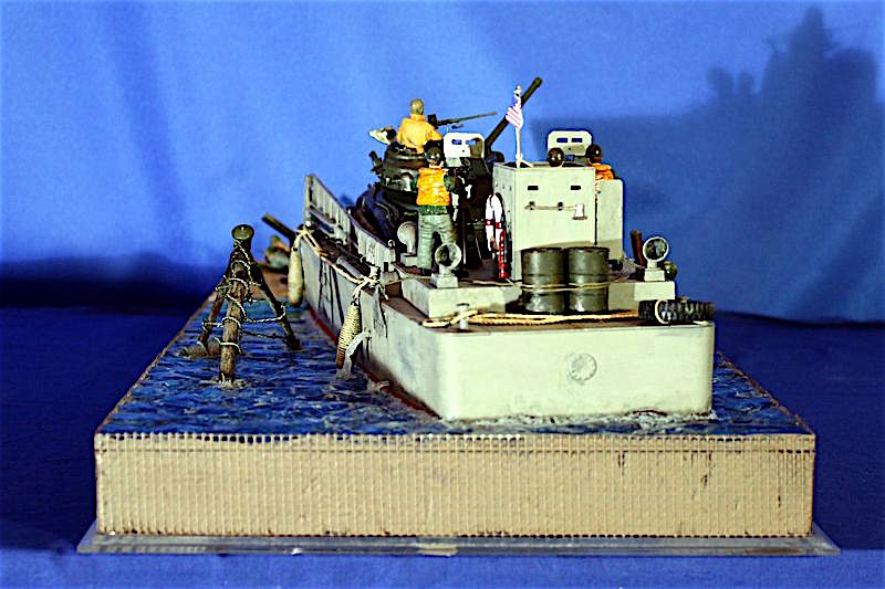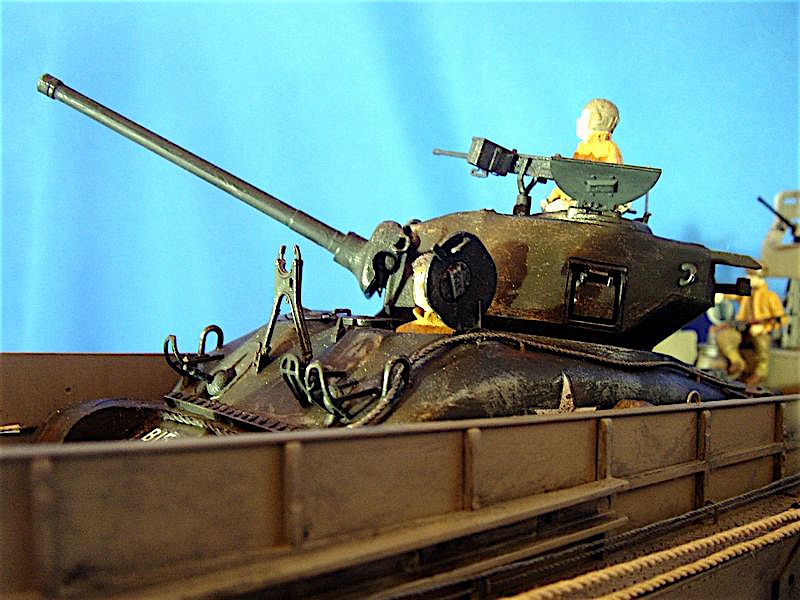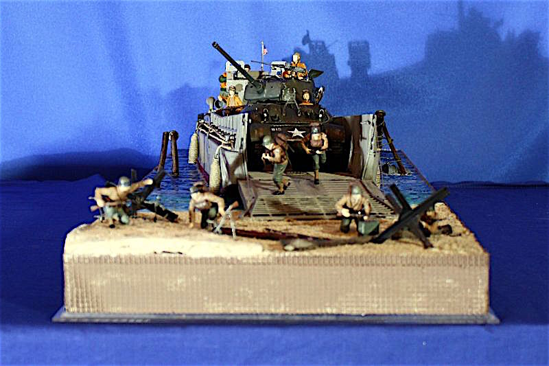 | Questo diorama mostra un mezzo da sbarco statunitense LCM impegnato nello spiaggiamento di un carro armato Sherman e di un plotone di Marines |