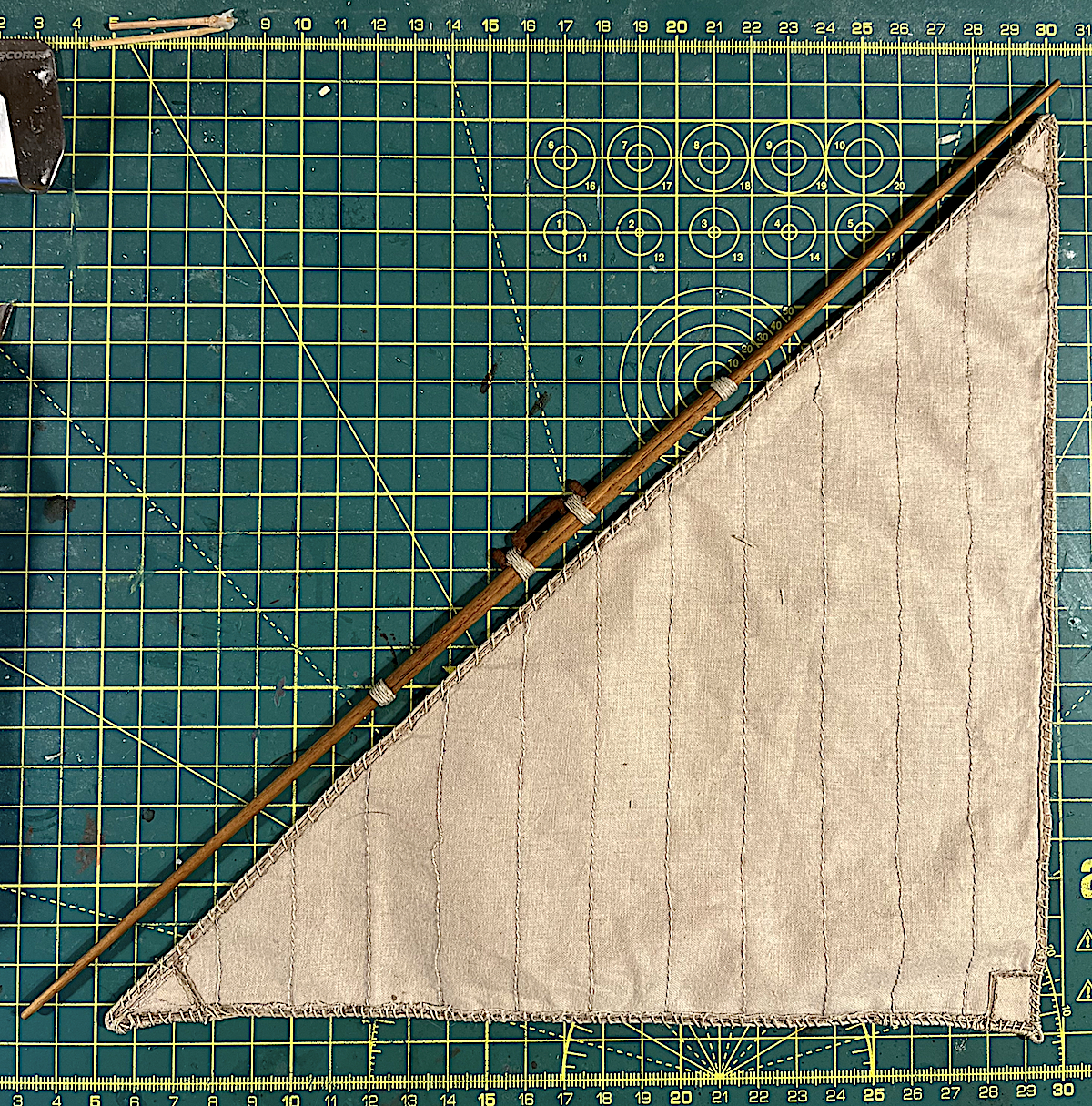 costruzione della vela e il fissaggio alla sua antenna. L'accurato collegamento di questa all'albero con un perfetto gioco di drizze e, più a destra, la vela montata a bordo. |