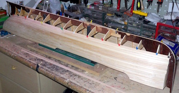 Quando questa struttura “fondamentale” sarà pronta, rigida e ben allineata, passiamo al fasciame. Per quest’operazione si utilizzano, di solito, listelli di tiglio spessi due mm. La larghezza può variare in funzione delle esigenze: più la zona è “stellata” più i listelli devono essere stretti. Se si costruisce un modello di dimensioni importanti, sul quale esistono zone abbastanza piane, come ad esempio le murate e il fondo, si possono usare pezzi di compensato di betulla, sempre da due mm. E’ chiaro che questa soluzione è utilizzabile nella costruzione di navi che saranno pitturate. Nel caso di scafi che saranno trattati con vernice trasparente, ad esempio antichi velieri, il rivestimento con listelli dovrà essere assolutamente preciso perché rimarrà visibile. I listelli del fasciame devono essere incollati alle ordinate e fra loro. Per tenerli fermi durante l’asciugatura della colla possono essere usati chiodini e mollette. |
