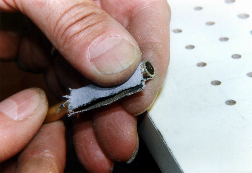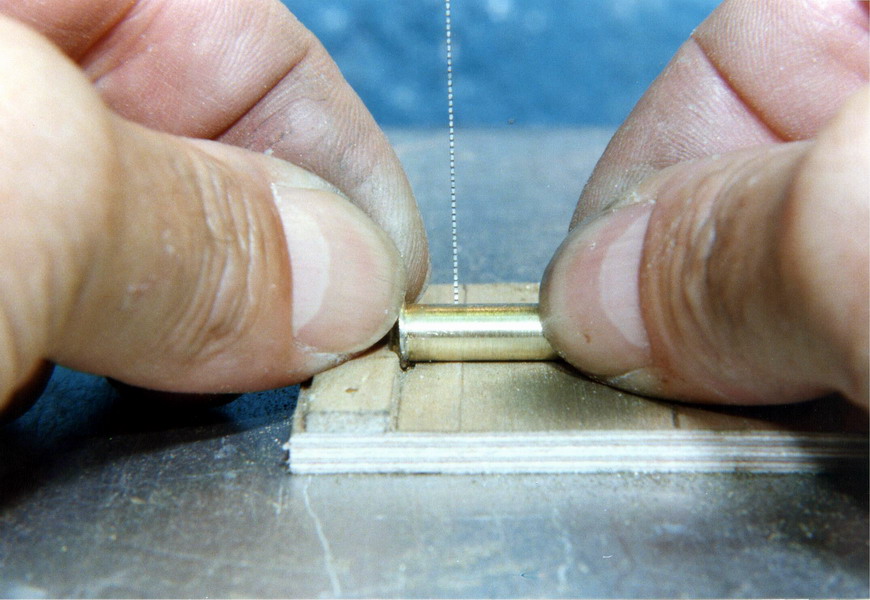 inserirvi, come già detto, un piccolo disco di acetato. Prima di tutto bisogna costruire una fustella. Io prendo un pezzetto del tubo che ho usato per fare l'oblò. Lo inserisco nel trapano, montato orizzontalmente, e, mentre gira, con un codino di topo lo svaso dall'interno verso l'esterno. Poi, con una lima piatta fine, lo limo esternamente verso l'estremità. In questo modo l'estremità del tubetto diventa tagliente. Non solo, il diametro del "taglio" sarà leggermente superiore al diametro interno dell'oblò. Poi fisso un pezzo di acetato da 1 mm di spessore ad un pezzo di legno (va benissimo un ritaglio di compensato di pioppo da 5 mm). Avvicino l'acetato alla fustella che sta ruotando nel trapano e "zac", viene ritagliato un perfetto dischetto che si andrà ad incastrare, forzando un po', all'interno dell'oblò. E' consigliabile estrarre ogni singolo dischetto ogni volta tagliato altrimenti si impasta tutto. |