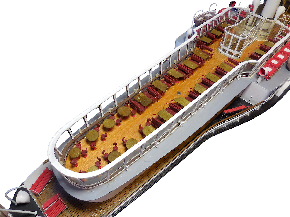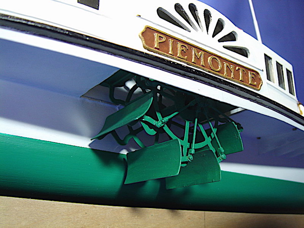 guadagnare un po’ di spinta. Ho preferito realizzare una costruzione la più leggera possibile con una accurata distribuzione dei pesi. La costruzione del modello si trova su: http://www.mitidelmare.it/Piroscafo_Piemonte.html |