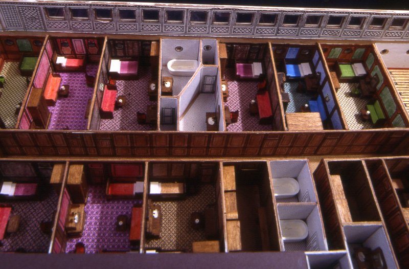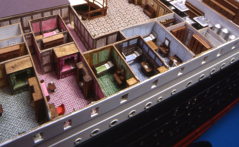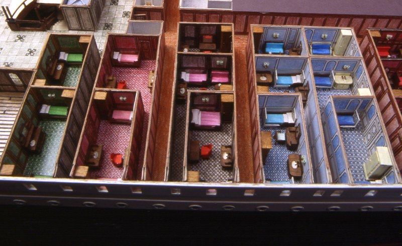 | Visita al ponte C - Il ponte C del Titanic è l'ultimo ponte arredato in questo modello. Coincide con il ponte di coperta. A proravia ci sono cabine di prima classe e, alle loro spalle, continua lo scalone che porta all'orologio. In questa hall si trova l'Uffico Commissari. Seguono, per tutta la zona centrale, altre cabine di prima classe. Si trovano anche un salone birreria e la sala del barbiere. A poppavia c'è un soggiorno e una hall di ingresso riservate ai passeggeri di seconda classe. |